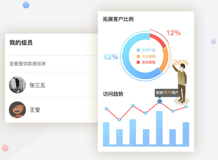 組員及客戶狀態(tài)一目了然,離職員工一鍵轉(zhuǎn)移名下客戶,保障公司掌控客戶資源
